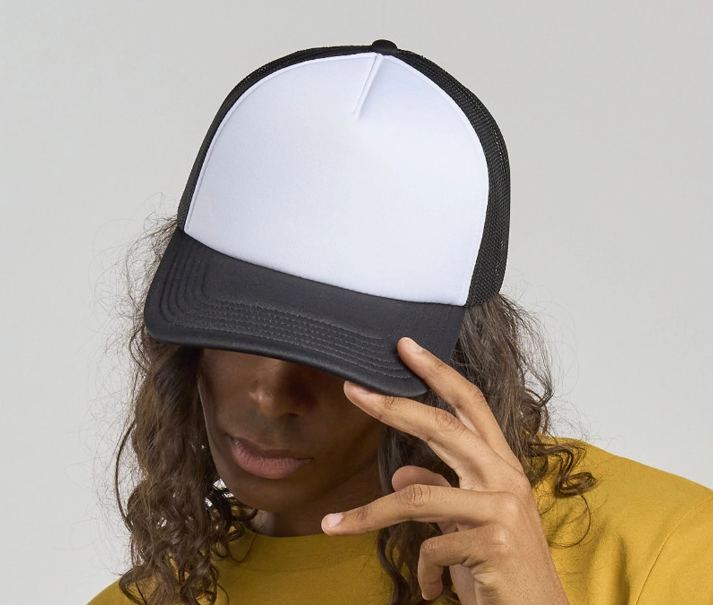Casquette style rappeur 5 panneaux - Filet à l'arrière et sur les côtés. Visière préformée rembourrée. Face avant rembourrée. Fermeture par picots en PVC. Étiquette détachable. Tour de tête 58cm. Idéale pour la sérigraphie, la broderie ou la sublimation.
